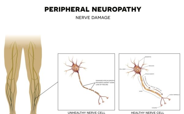 In diabetic patients, peripheral nerve damage is thought to be caused by long-term exposure to elevated blood sugar levels. High blood sugars are believed to cause direct damage to nerve fibers and impair their ability to transmit signals to the brain. Increased blood sugars have also been shown to cause damage to the blood vessels that supply the oxygen and nutrition needed for nerve fibers to function properly. Additionally, higher levels of a type of fat called triglycerides have been linked to an increased risk for the development of peripheral neuropathy in a variety of conditions including diabetes.